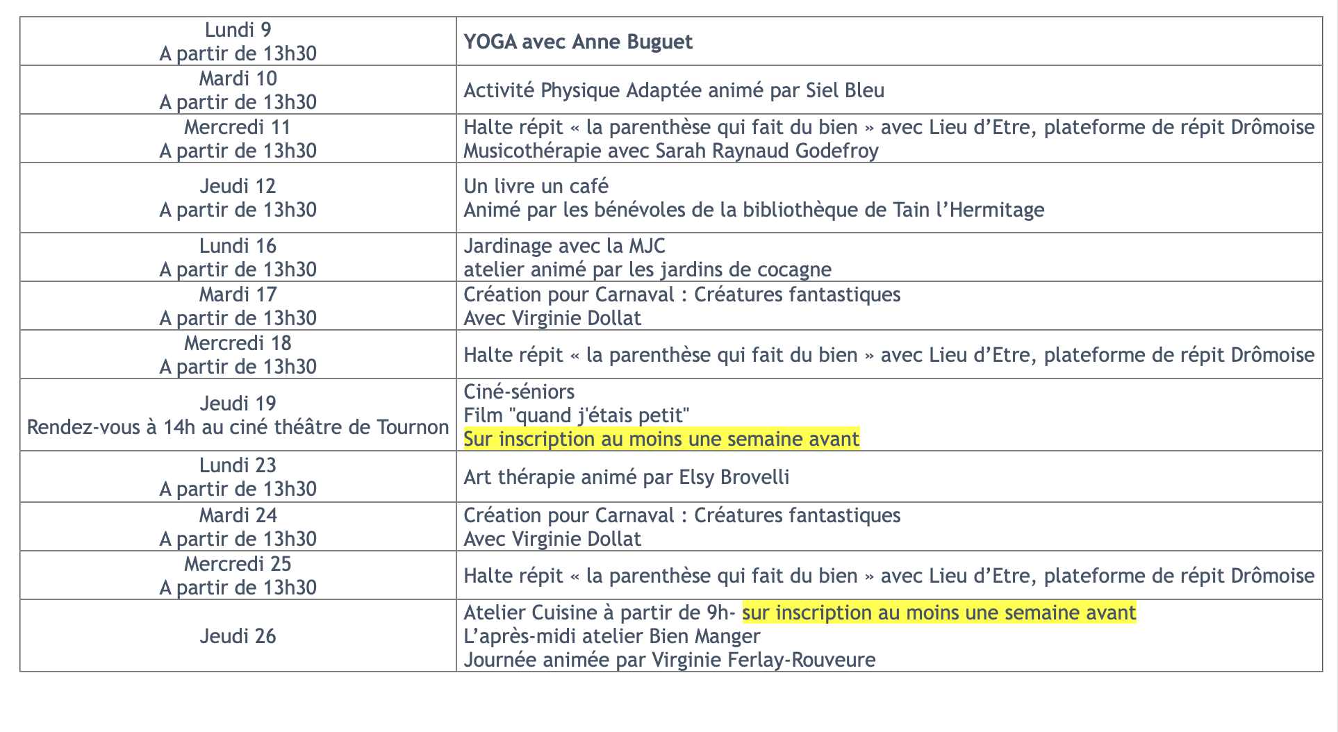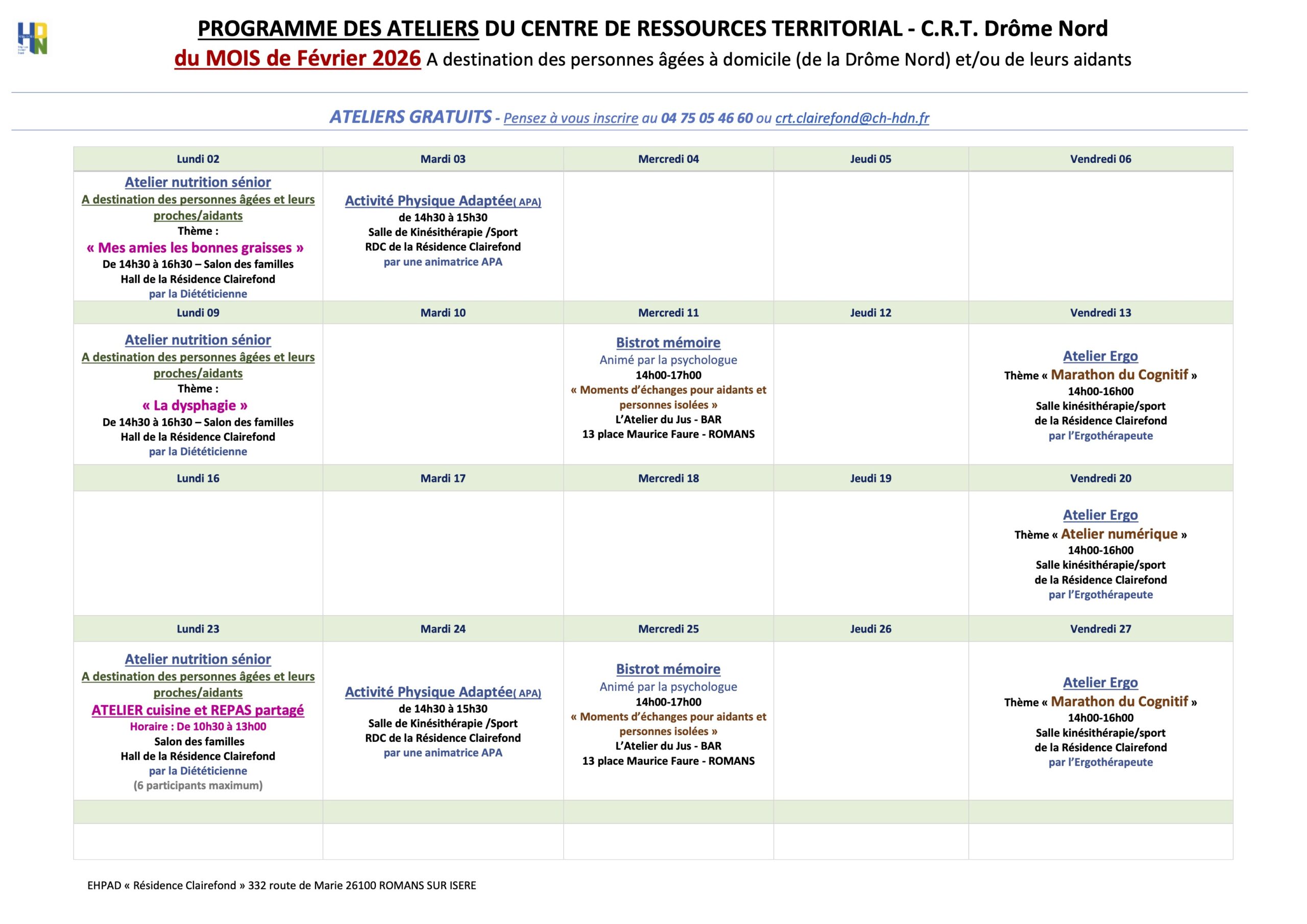 Tous ces ateliers sont gratuits. Ils se déroulent, pour la plupart, au sein de la Résidence Clairefond de Romans, hormis le « Bistrot Mémoire » proposé par la psychologue à l’Atelier du Jus, Place Maurice Faure à Romans.