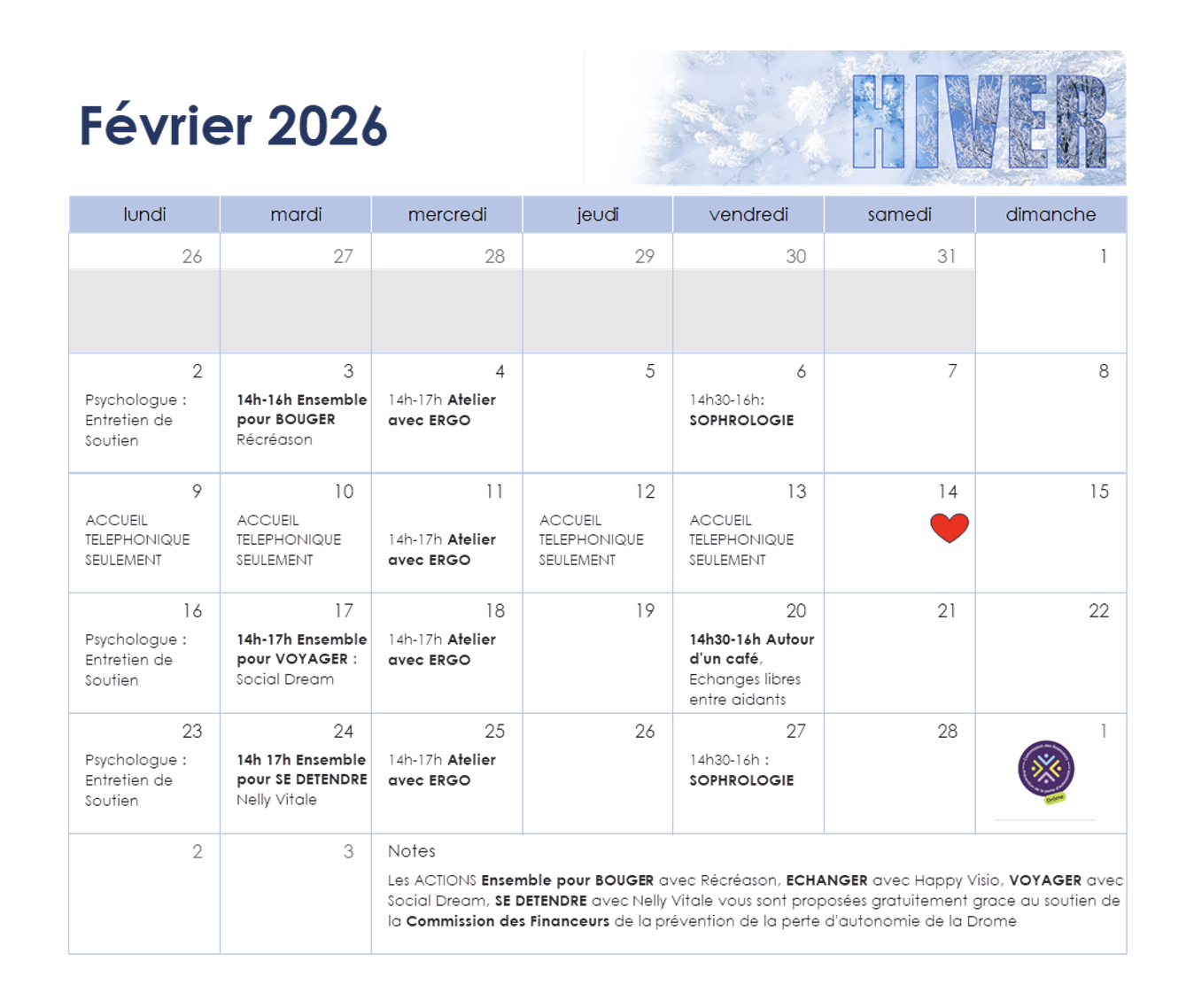 Programme des actions prévues à la Plateforme de répit et d’accompagnement des Aidants pour le mois de février 2026.