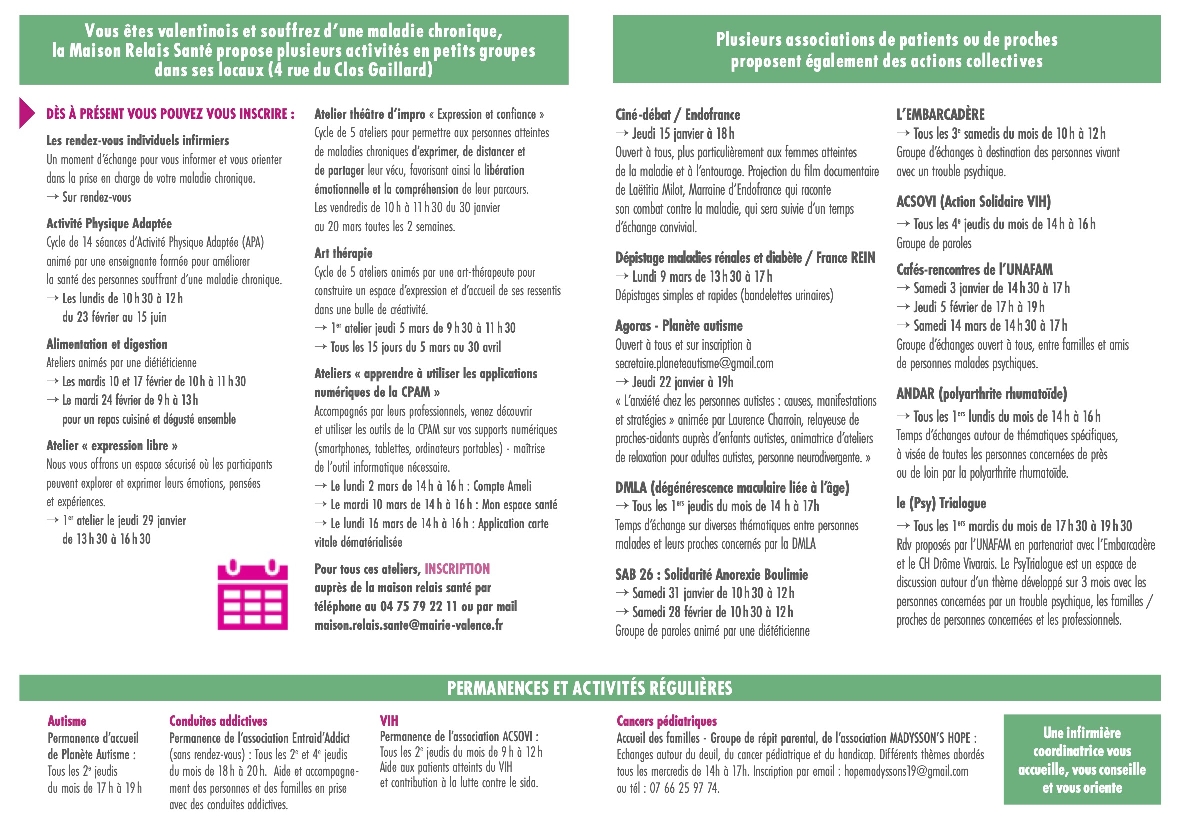 Pour y participer, il est conseillé de s’inscrire par mail au crt.clairefond@ch-hdn.fr ou par téléphone au 04.75.05.46.60.