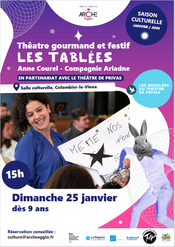 – Dimanche 25 janvier à Colombier-le-Vieux – 15h00 (salle communale): théâtre gourmand « LES TABLEES » Anne Courel Compagnie Ariadne