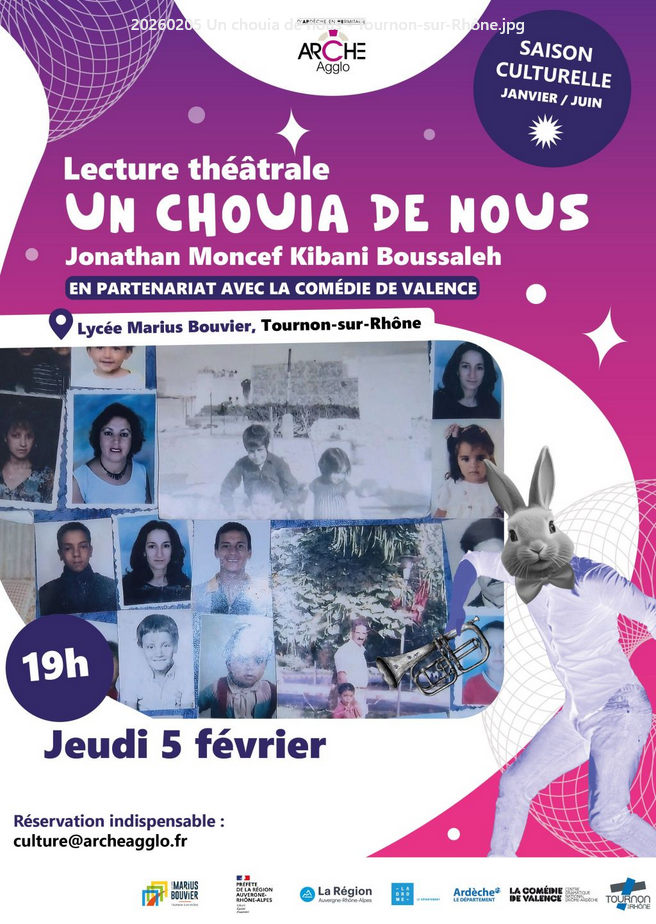 – Jeudi 5 février à Tournon-sur-Rhône – 19h00 (lycée Marius Bouvier): lecture théâtrale « UN CHOUI DE NOUS »